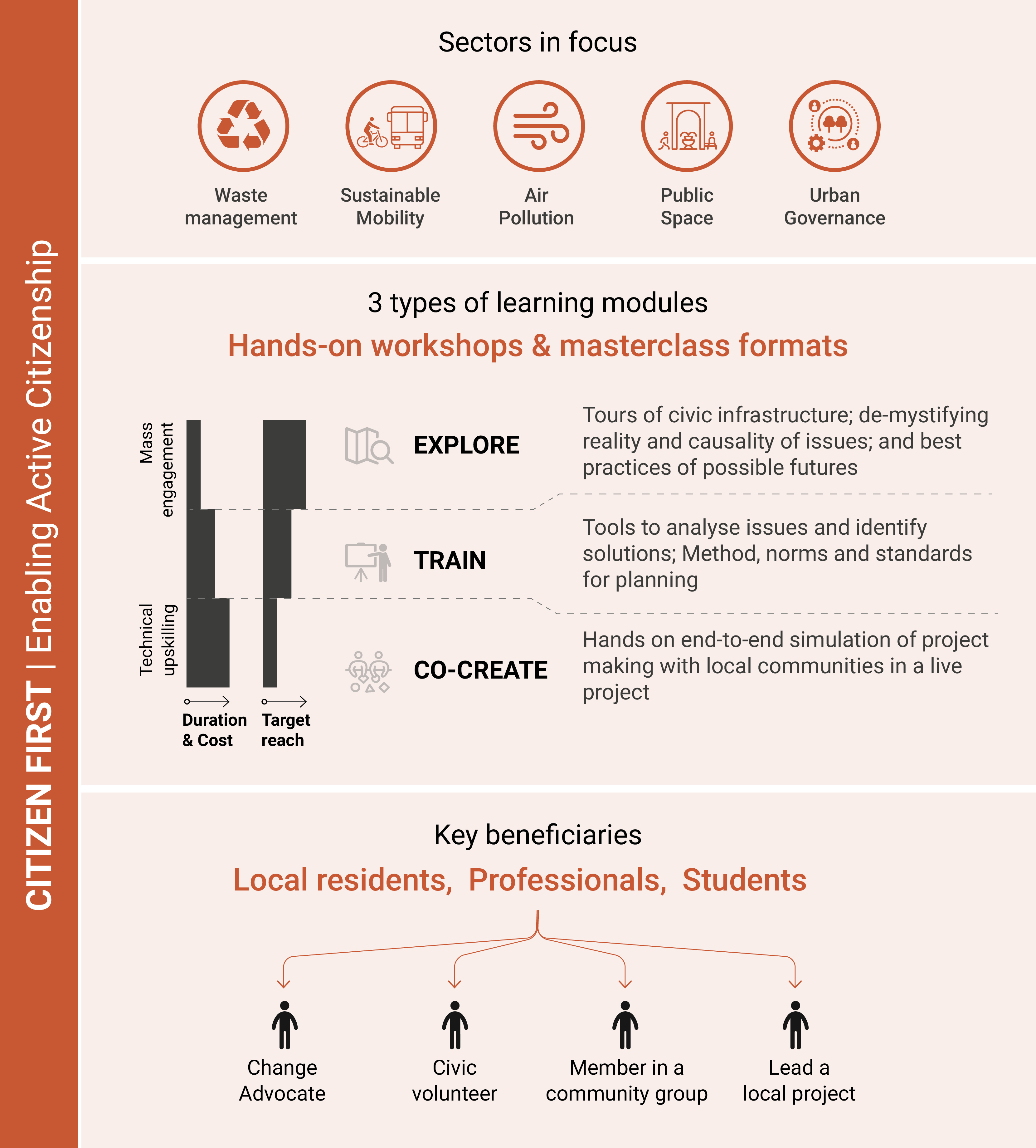 We have used the last six years of our experience working at the intersection of urban planning and governance to develop ‘Citizen First’. It is an application-oriented, practitioner-led learning program to capacitate citizens engaging in the civic space. It combines essential domain knowledge and on-ground insights from practice with field exposure and hands-on training in vital tools/software.
