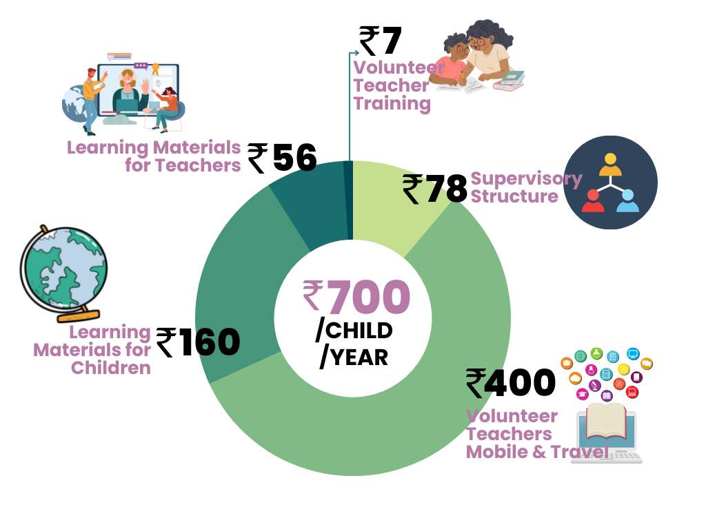 Per child cost of rolling out the FLC program for one year is 3,120 INR. Out of this, the per child cost of 2,420 INR is the value of time donated by volunteer teachers during the year in supporting the program. The volunteer teachers are not paid any salary and are only reimbursed for their mobile data and travel costs. The remaining 700 INR per child cost will be borne by ASPIRE and includes expenses on teaching material, stationery, training of volunteer teachers, mobile data pack and travel cost of volunteer teachers, and supervisory structure cost.