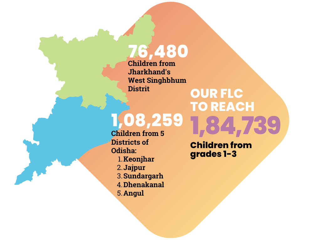 Currently, there are 185,000 children in grades 1 to 3 in 5000 government schools in the 39 blocks. Through our FLC we want to reach out to each & every child of grades 1 to 3 in these blocks in Orissa & Jharkhand. We are raising around 12.95 crores – 700 INR *185,000 children - to cover the current year's cost expenses borne in running the Foundational Learning Campaign.