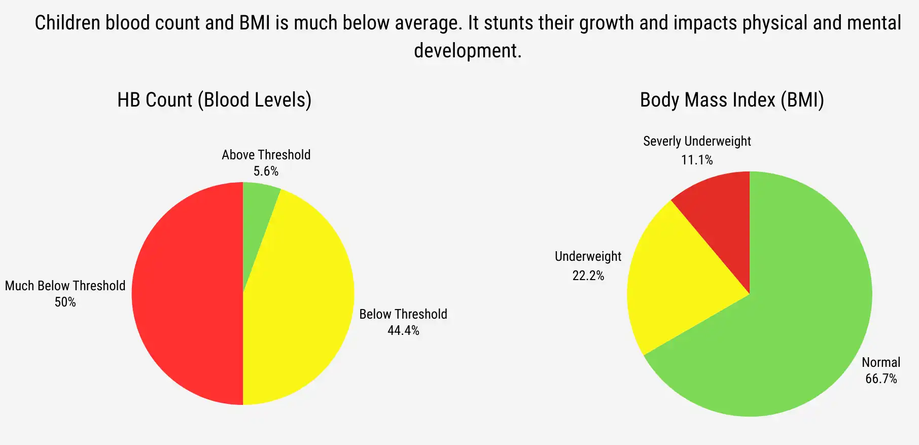 90% of children living in Raigarh have a blood count below the recommended threshold value. More than 30% of children are severely malnourished and have a BMI below 18.5. It leads to the prevalence of stunting (low height for age), wasting (low weight for height), and being underweight among children has been a major concern.