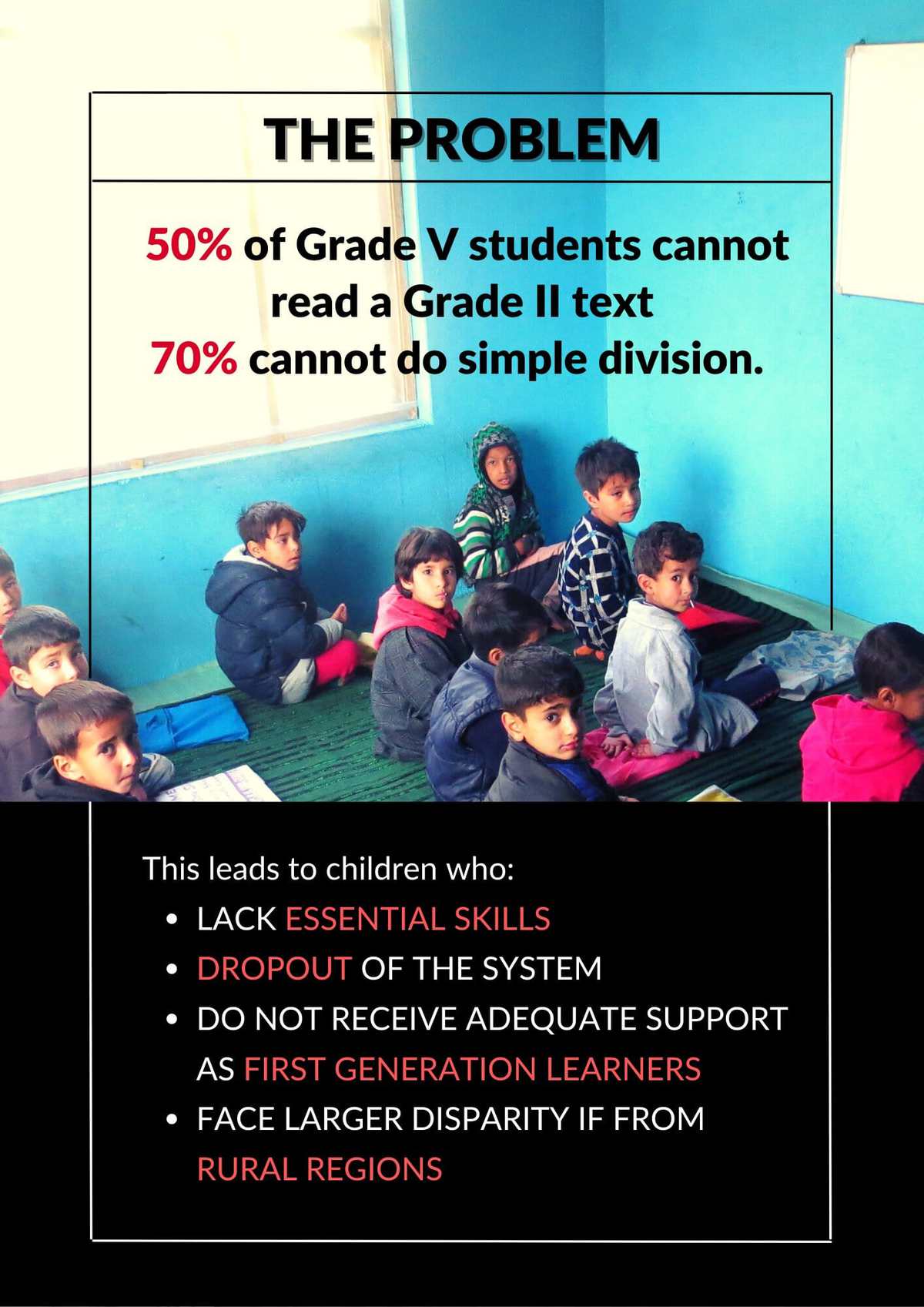 The All India figures from ASER, 2018 show that 50% of Grade five students cannot read a Grade two text, and 70% cannot do simple division. Further data indicate that this gap increases and leads to a lack of essential skills when these students reach higher grades leading to dropouts. School ecosystems in India do not always address students' evolving needs, many of whom may be the first in their families to attend school.