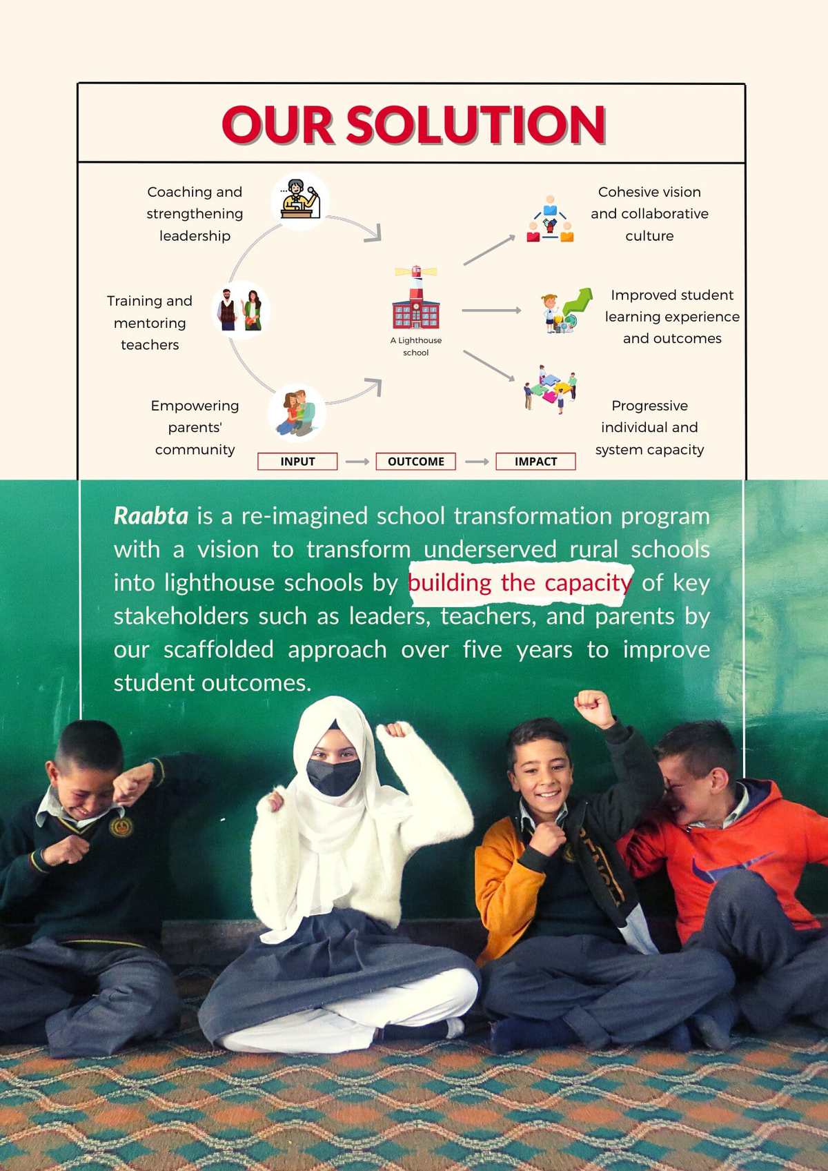Our solution is to transform underserved schools into lighthouse schools by building the capacity of key stakeholders such as leaders, teachers, and parents by our scaffolded approach over five years to improve student learning experiences and outcomes.
