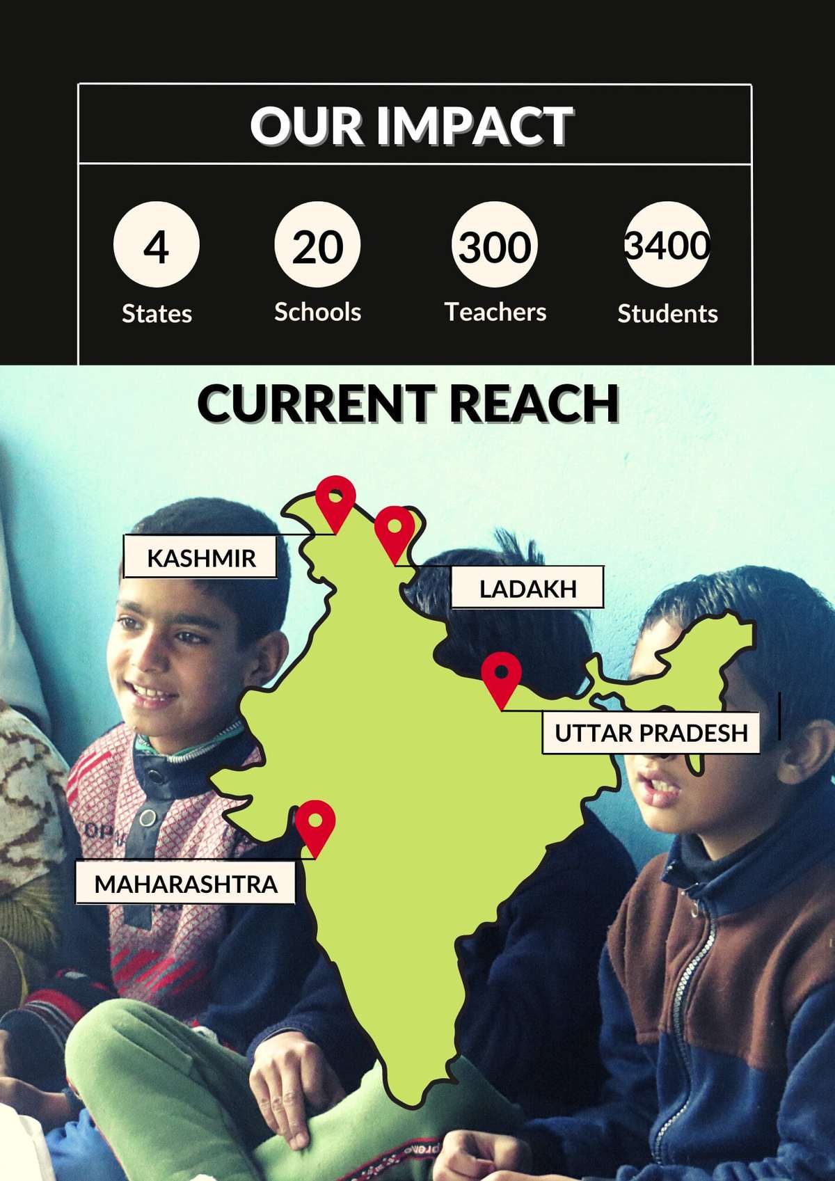 We work to realize this through different programs to intervene at various stages of a child's education; through early childhood, formal schooling, life in their communities, and eventually their transition from schools to colleges. We are currently in the first phase of our flagship program, Raabta, a systemic (school) transformation program working with three stakeholders in rural community public schools. We are focussing on Ladakh, Kashmir, and Uttar Pradesh to build our intervention.