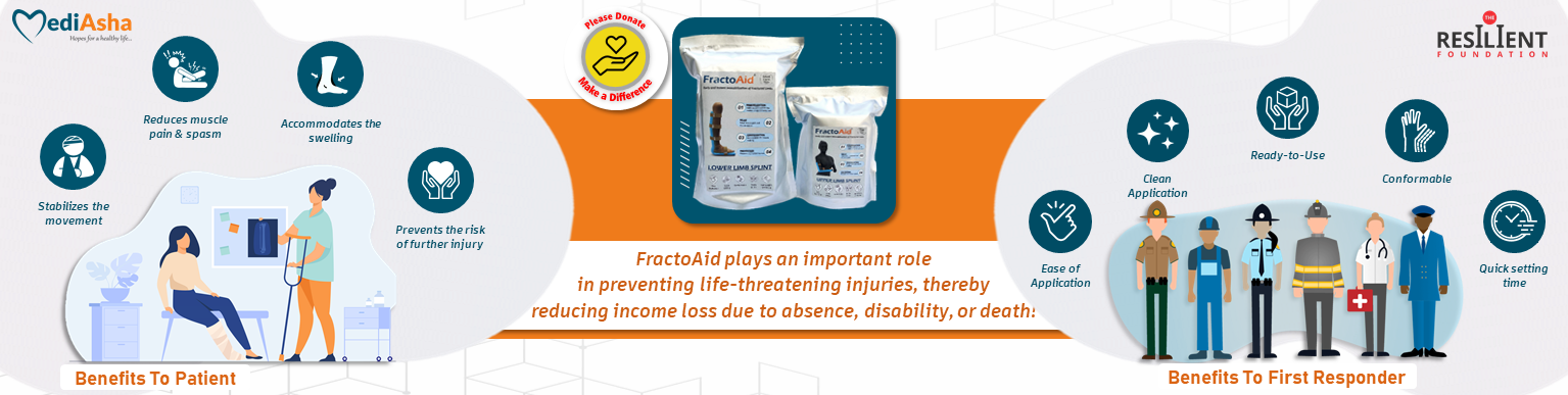Availability of FractoAid splints to Mrityunjay Devdoot will help in early fracture management in the golden hour and provide relief to the patient from muscle pain and spasm due to accidental movement of the injured limb. Furthermore, it will promote better & faster healing and prevents limb-threatening injuries which lead to lifelong disabilities.