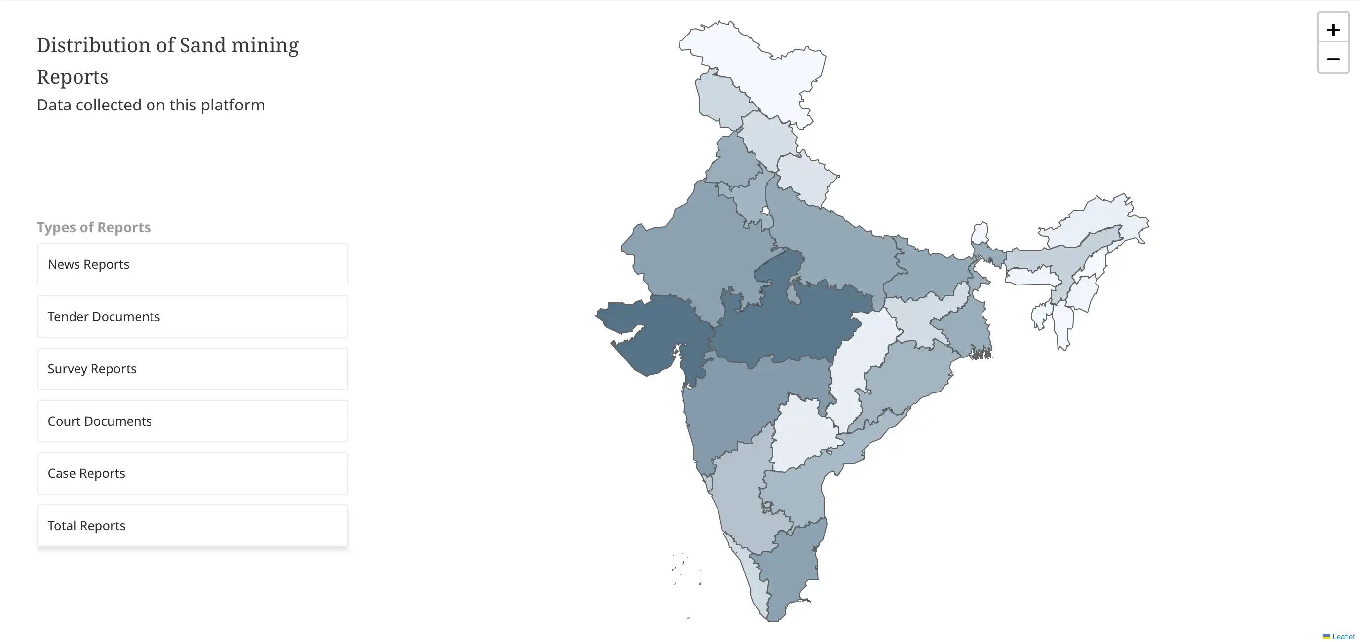 The platform also shows state-wise distribution of sand mining data across different report types. Click on any state to view its data on sand mining.