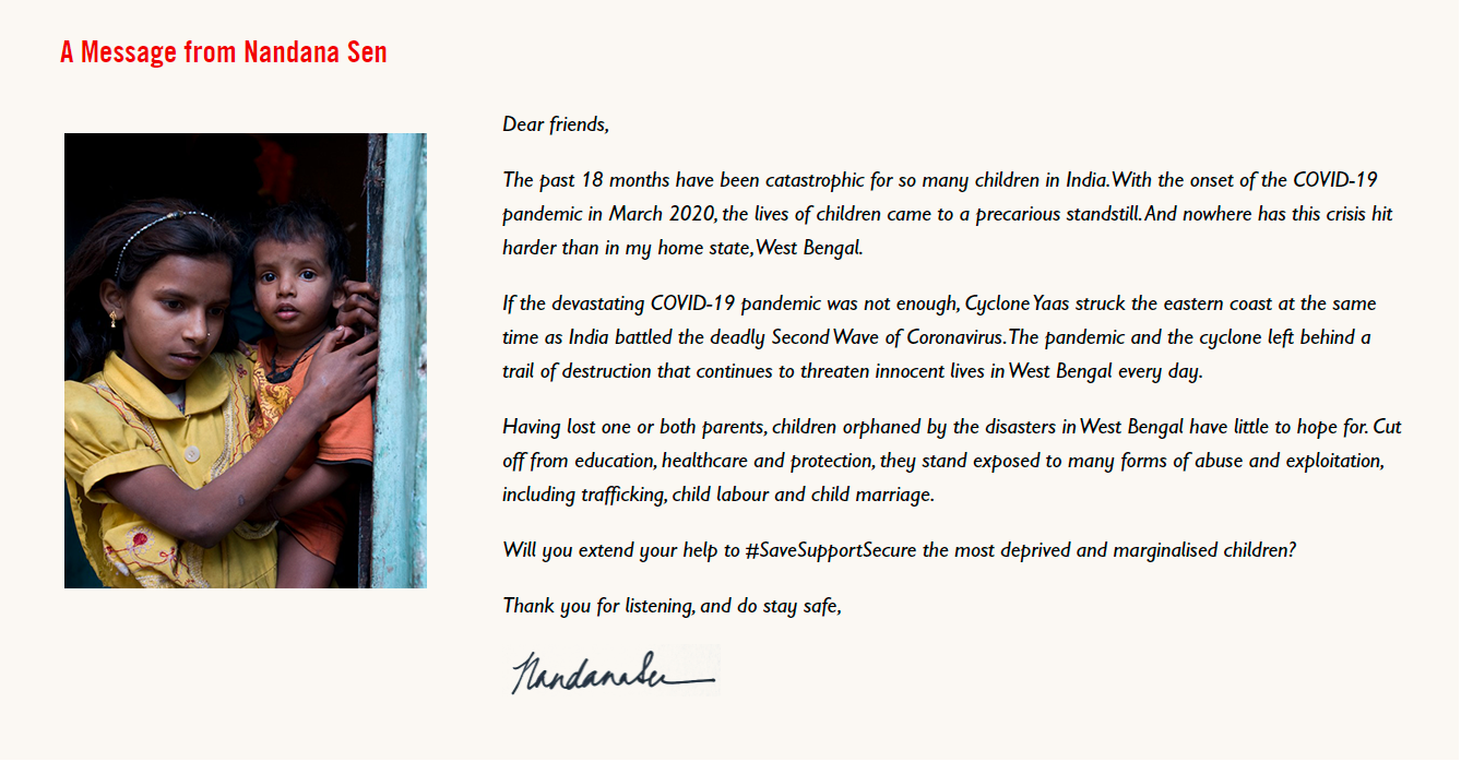 The first INR 20 lakh of contributions to support West Bengal’s bereaved children will be fully matched by Nandana Sen