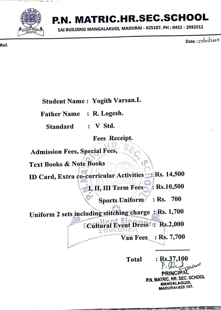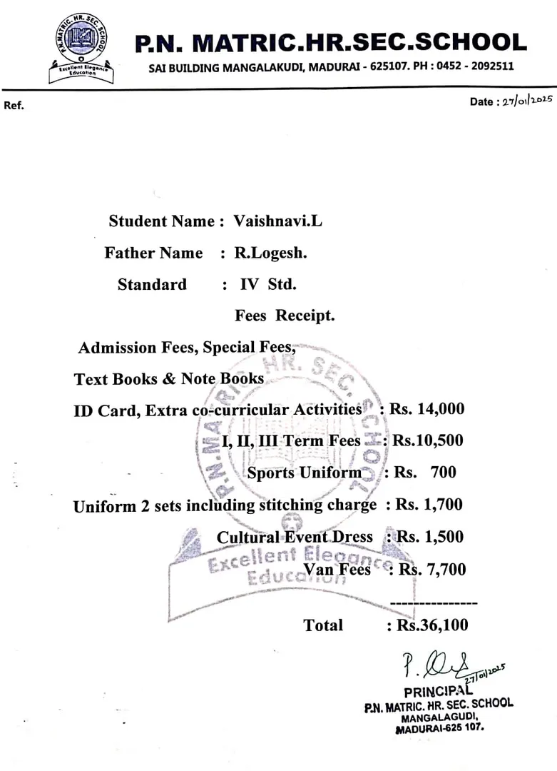 Yogith and Vaishnavi hail from the Kodikulam, Malaiyandipuram, Madurai District. Both of them are studying at PN Matriculation Higher Secondary School, Mangalakudi, Madurai. Their father earns daily wages by cleaning the vehicles and their mother is unable to work due to the health issues post-impact of covid-19. Due to their current financial situation, they are not in a position to pay for the school tuition fees. To continue their studies Yogith and Vaishnavi require your help and support. The fee for Yogith (5th Standard) is INR 37,100 and Vaishnavi (4th Standard) is INR 36,100.