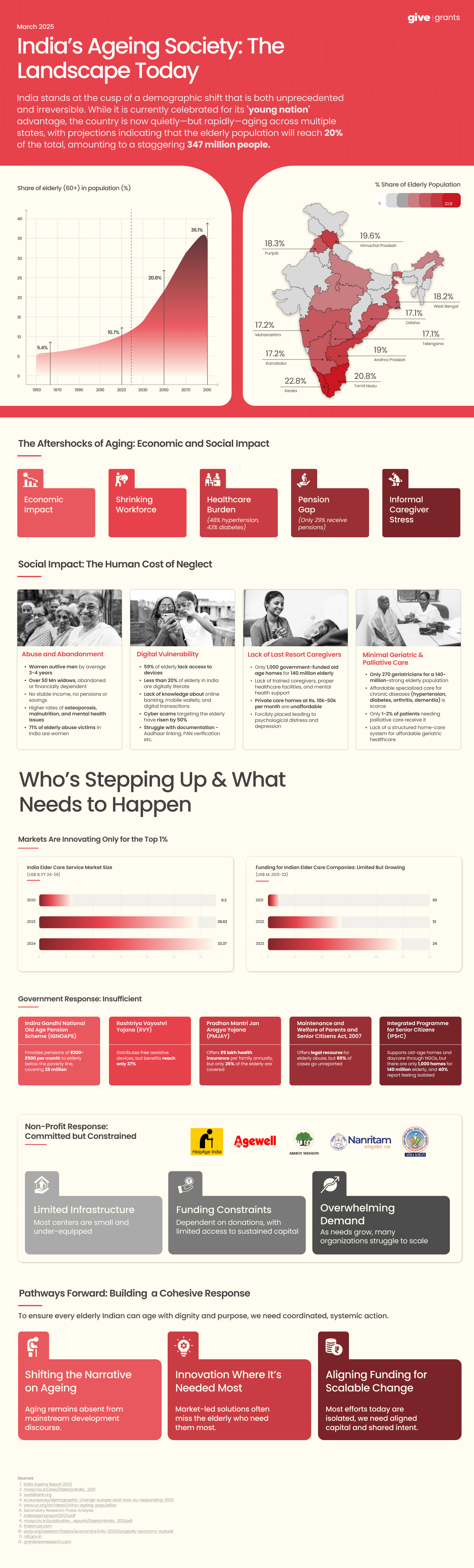 As India transitions from a much-celebrated young nation to an ageing society, its economic, healthcare, and social systems are struggling to keep pace. With 347 million elderly projected by 2050, the question is no longer if we need to act, but how soon and how well we do it. This research captures the scale of the challenge, presents the lived realities of those most affected, highlights the fragmented response across sectors, and underscores the urgent need for coordinated action.